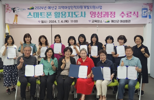 [금요저널] 예산군은 지난 4월 29일부터 7월 4일까지 2024년 지역여성인적자원 개발지원사업으로 ‘스마트폰활용지도사 양성과정’ 직업교육훈련을 성실히 이수한 수강생 13명에 수료증과 자격증을 수여했다.