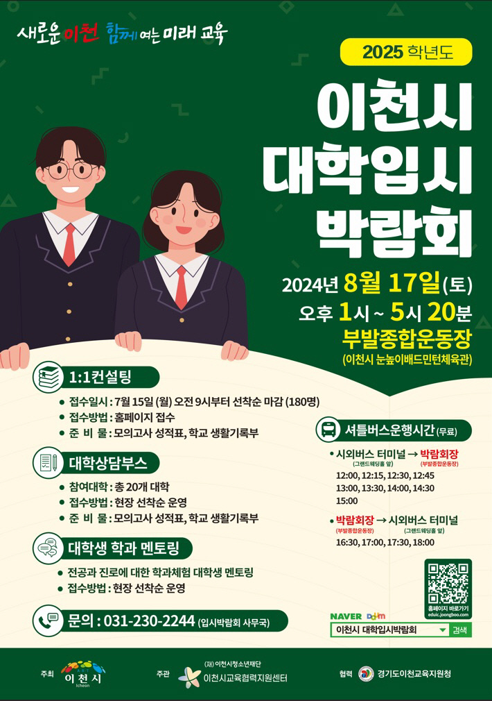 이천시가 관내 학생과 학부모에게 최신 대학 진학 정보를 제공하기 위해 다음달 17일 이천시종합운동장 내 이천시눈높이배드민터체육관에서 ‘2025학년도 이천시 대학입시 박람회’를 개최한다.