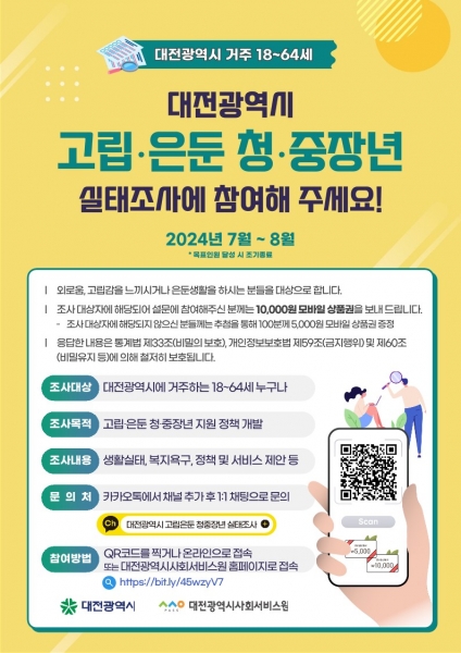 실태조사 대상은 대전시 거주 18~64세 청·중장년이며 조사 항목은 고립·은둔 청·중장년의 △일상생활 △사회적 관계 △신체 및 정신 건강 △정책 욕구 등이다.