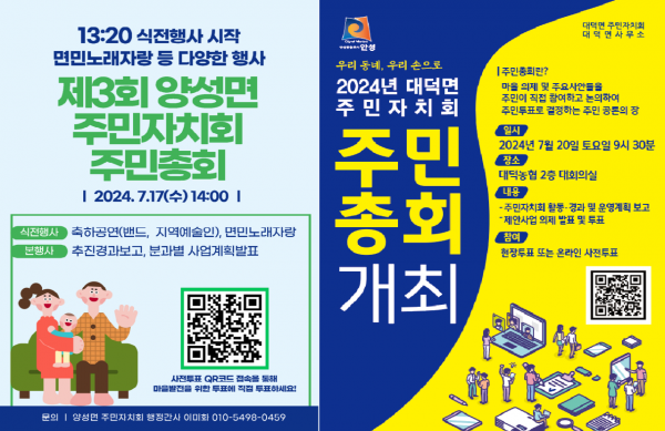 [금요저널] 안성시에서는 7월 17일과 7월 20일 양일간 각각 양성면과 대덕면 주민자치회 주최로 주민총회를 개최한다고 밝혔다.