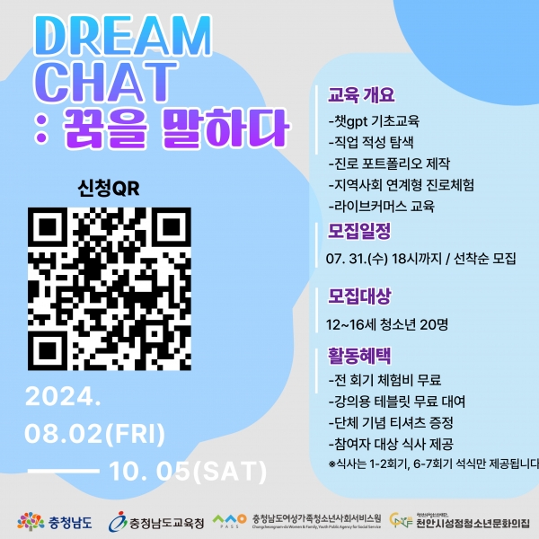 [금요저널] 천안시청소년재단 천안시성정청소년문화의집은 31일까지 청소년 대상 디지털 역량 강화 프로그램 ‘Dream Chat: 꿈을 말하다’ 참가자를 모집한다고 밝혔다.