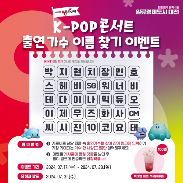 [금요저널] 대전시는 8월 9일부터 열리는‘2024 대전 0시 축제’의 대표 프로그램인 K-POP 콘서트 출연 뮤지션 중, 시민들이 가장 보고 싶은 가수는 누구인지 알아보는 SNS 이벤트를 진행한다.