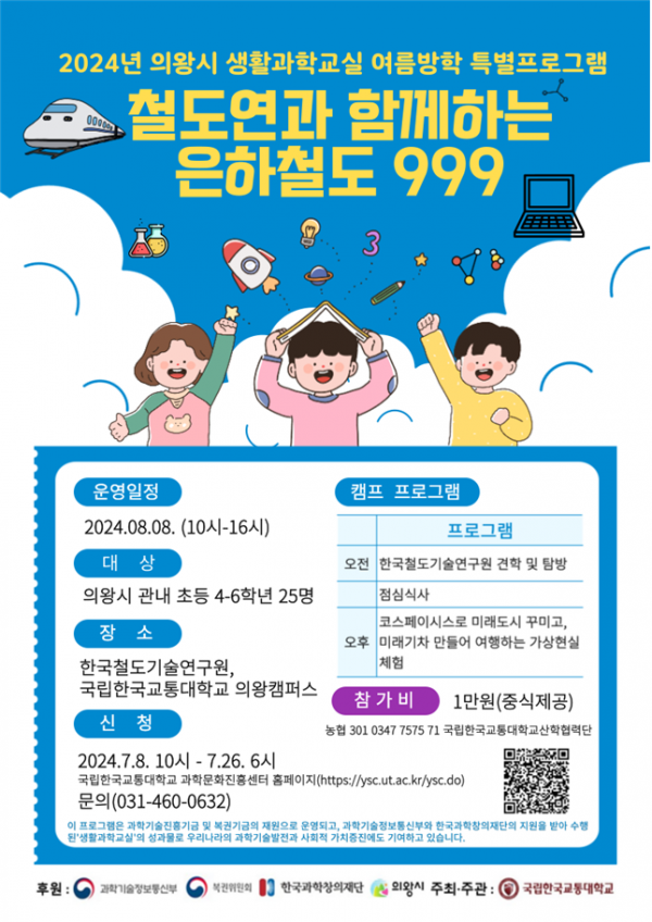 프로그램은 오는 8월 8일 한국철도기술연구원, 국립한국교통대학교 의왕캠퍼스에서 관내 초등학생 4~6학년 학생 25명을 대상으로 진행하며 참가비는 1만원이다.