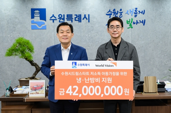 월드비전 경기남부사업본부 최성호 본부장은 16일 수원시청을 방문해 이재준 수원시장에게 ‘월드비전 냉·난방비 지원사업’ 지원금을 전달했다.