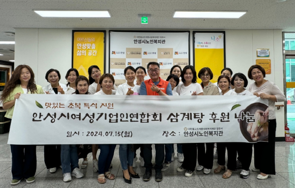 [금요저널] 안성시노인복지관은 지난 15일 안성시여성기업인연합회 회원들이 복지관 이용 어르신을 대상으로 ‘초복맞이 삼계탕 나눔 행사’를 진행했다고 밝혔다.