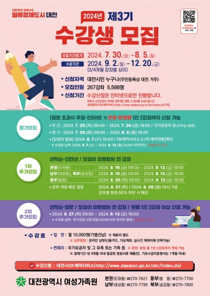 [금요저널] 대전여성가족원은 7월 30일 09시부터 8월 5일 오후 6시까지 7일간 2024년 제3기 강좌 수강생 5,588명을 모집한다.