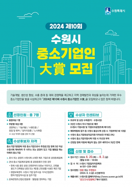[금요저널] 수원시가 ‘제10회 수원시 중소기업인 大賞’ 후보자를 8월 2일까지 공개모집한다.