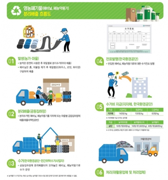 영농폐기물은 영농폐비닐과 폐농약용기류로 분류되며 마을 단위로 설치된 공동집하장에 보관 후 한국환경공단 민간위탁수거사업자가 공단 영농폐비닐 재활용시설으로 이송해 처리된다.