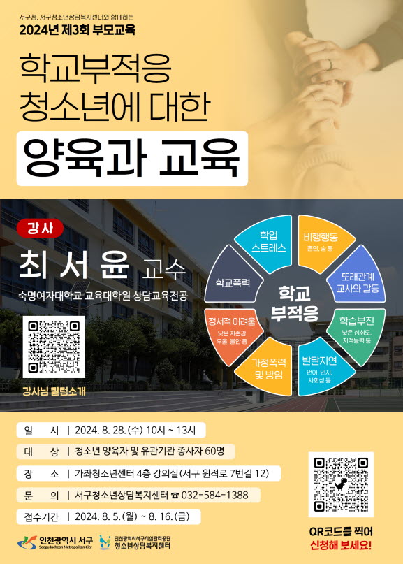 이에 센터는 학교부적응 청소년에 대한 이해를 높이고 양육기술 및 교육지도를 위해 부모와 청소년 관련기관 종사자를 대상으로 8월 28일 10~오후 1시 가좌청소년센터 4층 교육실에서 최서윤 교수를 초빙해 부모교육을 개최한다.