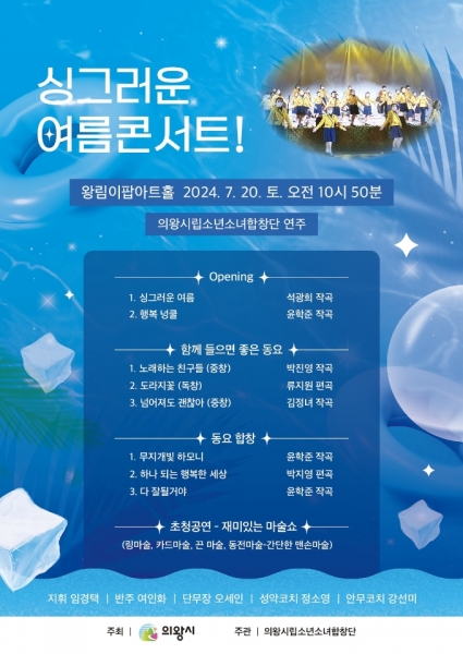 [금요저널] 의왕시가 주최하고 의왕시립소년소녀합창단이 주관하는 ‘싱그러운 여름 콘서트’가 7월 20일 토요일 오전 10시 50분부터 12시까지 의왕시 왕림이팝아트홀에서 개최된다.
