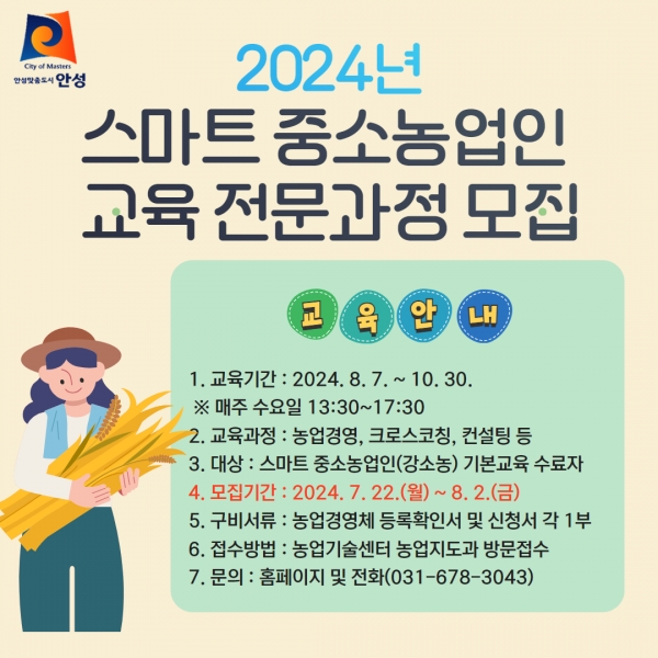 [금요저널] 안성시농업기술센터는 7월 22일부터 8월 2일까지 ‘2024년 스마트 중소농업인 육성 전문과정’교육생을 모집한다고 밝혔다.