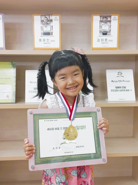 조아윤 어린이의 어머니는 “아이들이 책과 친하게 지내고 책 읽기를 좋아했으면 하는 바람으로 시작했다”며 “세천책 읽기에 도전하며 수월하게 한글도 떼고 책 읽기도 거뜬히 하는 예비 초등학생이 되도록 책과 한 걸음 더 친해질 수 있게 좋은 프로그램을 만들어주신 도서관에 감사하다”고 소감을 전했다.