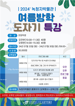 접수기간은 7월 23일 오전 10시부터 선착순 마감될 때까지 녹청자박물관 홈페이지에서 온라인 접수로만 진행된다.