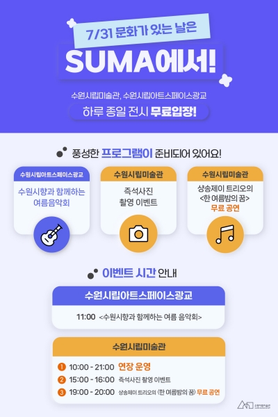 ‘문화가 있는 날’인 7월 31일 수요일 행궁동에 위치한 수원시립미술관은 무료입장과 오후 9시까지 야간 개방을 실시하며 오후 3시에는 미술관 로비에서 선착순 50명을 대상으로 즉석 사진 촬영 이벤트가 진행된다.