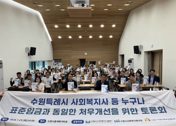 [금요저널] 수원시는 23일 홍재복지타운에서 ‘2024년 사회복지사 등 처우개선 토론회’를 열고 사회복지시설 종사자를 대상으로 한 표준임금체계 도입 방안을 논의했다.