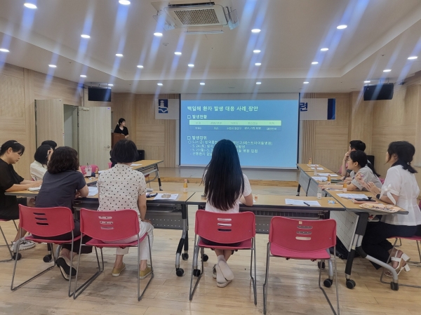 장안구보건소 대강당에서 각 보건소 담당자들이 감염병 역량강화 훈련을 하고 있다.