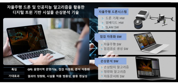 ‘디지털트윈 기술을 적용한 “자율주행 드론시스템”과 “인공지능 알고리즘”을 이용한 콘크리트 구조물 외관 조사 기술’은 드론 점검 자동화 기술로 콘크리트 구조물의 균열, 파손, 철근노출 등의 손상을 분석하는 외관조사 기술로 시설물 안전관리 및 사고예방에 기여할 것으로 예상된다.