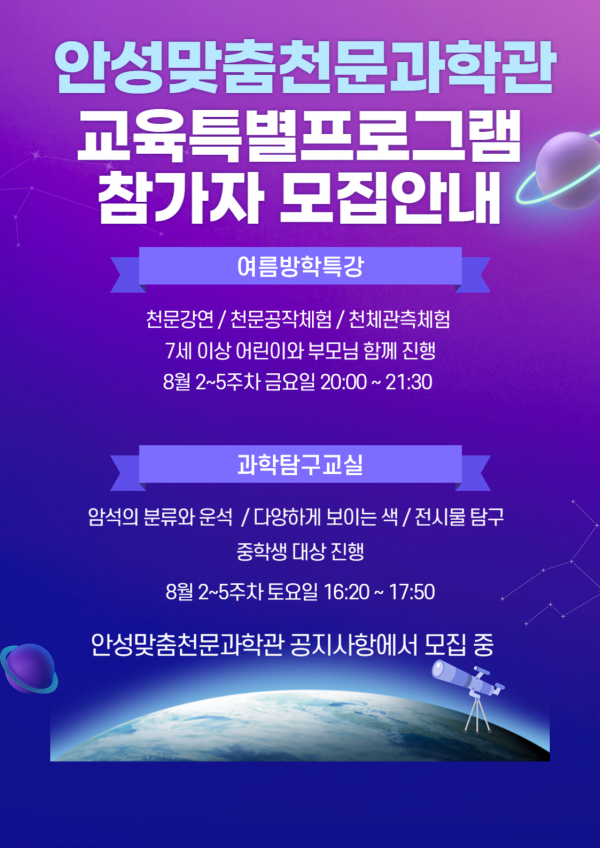 [금요저널] 안성시는 여름방학을 맞이해 안성맞춤랜드 천문과학관에서 오는 8월 2주차~5주차 금요일 토요일에 ‘여름방학특강’과 ‘과학탐구교실’을 운영한다고 밝혔다.