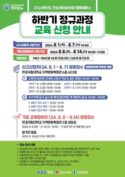 정규과정은 안성시민 1974년생부터 1955년생으로 나이 제한이 있고 신규신청자는 8월 1일 ~ 8월 7일 오후 2시까지, 기존교육생은 8월 8일 ~ 8월 14일 오전 10시 ~ 오후 5시까지 행복캠퍼스에 방문 신청하면 되고 수강료는 전액 무료이다.