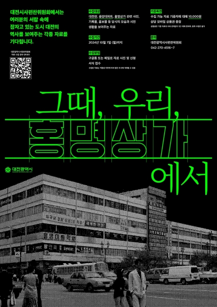 10월 7일까지 추진하는 이번 사업은 옛날 사진, 문서 기념품, 지도, 포스터, 티켓, 책 등 유형에 구애됨 없이 대전천, 중앙데파트, 홍명상가와 관련된 자료를 대상으로 한다.