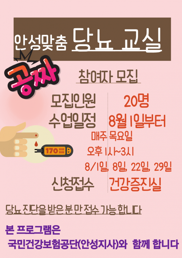 “안성맞춤 당뇨교실”은 당뇨진단을 받은 60세 이상 안성시 거주자는 누구나 참여할 수 있으며 수업은 무료로 진행된다.
