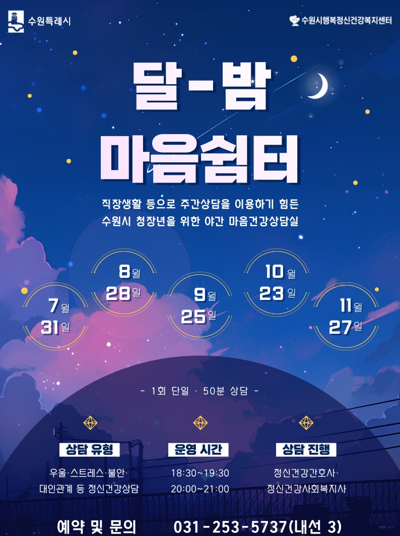 수원시행복정신건강복지센터가 직장생활, 학업 등으로 주간 상담이 어려운 청수년과 장년을 대상으로 야간 마음건강상담 프로그램 ‘달밤 마음쉼터’를 운영한다.