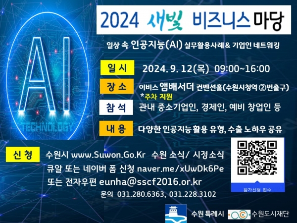 수원시 관계자는 “AI에 관심 있는 기업인, 창업자들에게 실질적으로 도움이 될 수 있는 행사”며 “같은 분야 전문가들과 교류하며 네트워킹할 수 있는 좋은 기회가 될 것”이라고 말했다.