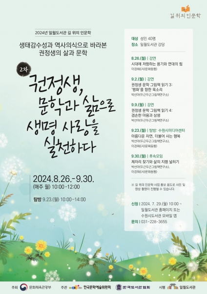 [금요저널] 수원시 일월도서관이 길 위의 인문학 ‘권정생, 문학과 삶으로 생명 사랑을 실천하다’ 강의에 참여할 시민 40명을 7월 29일부터 모집한다.