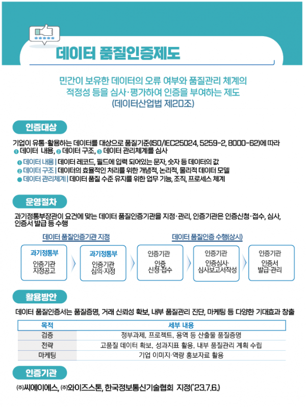 한편 과기정통부는 성장 잠재력을 가진 인공지능·데이터 중소기업 및 초기 중견기업의 경쟁력 강화를 지원하기 위해 데이터 품질인증 지원사업을 추진하고 있어, 정형데이터, 비정형데이터, 데이터 관리체계 인증에 관심있는 기업은 지원을 신청할 수 있다.
