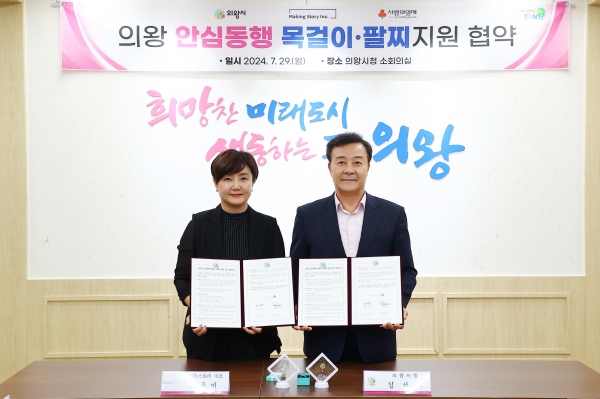 [금요저널] 의왕시는 29일 메이킹스토리와 취약계층 지원을 위한 ‘의왕 안심동행 목걸이·팔찌 지원’ 사업 업무협약을 체결했다고 30일 밝혔다.
