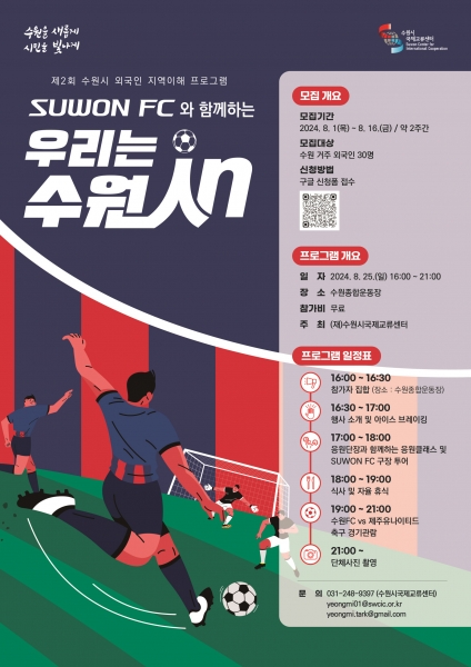 수원시 국제교류센터는 오는 25일 수원FC와 협업해 진행하는 ‘제2회 수원시 외국인 지역이해 프로그램’에 참가할 수원 거주 외국인 30명을 17일까지 모집한다.
