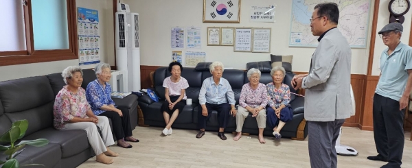 [금요저널] 폭염 위기경보 ‘경계’ 단계 발령에 따라 폭염을 대비해 피해를 예방하고자 관내 어르신들의 폭염으로 인한 피해상황은 없는지와 애로사항 청취 및 기타 안부확인을 위해 지난 7월 29일부터 31일까지 3일간 삼죽면 경로당 28개소를 순회 방문했다.