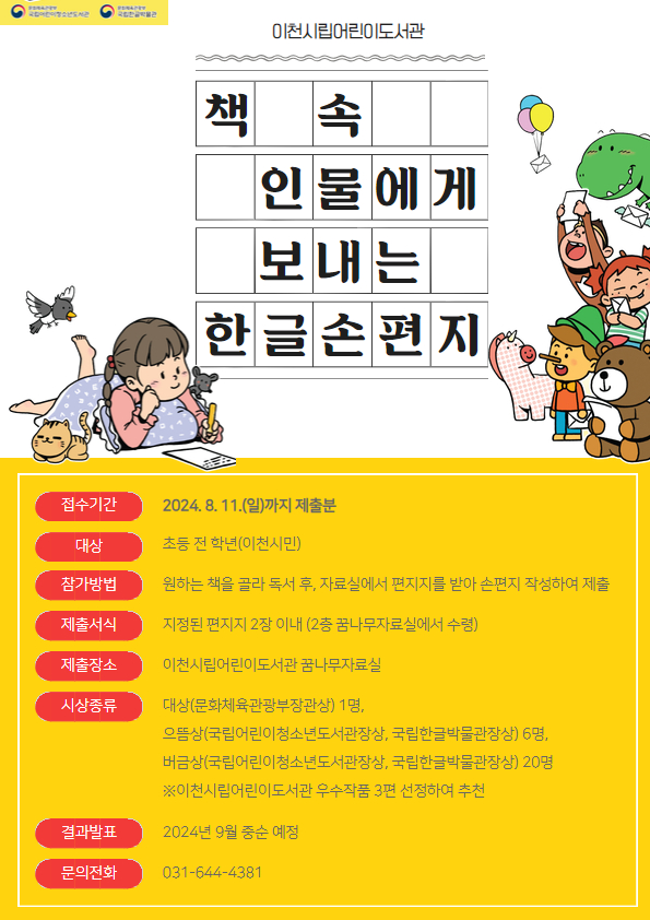 이천시립어린이도서관, ‘책 속 인물에게 보내는 한글 손 편지’ 공모전 운영