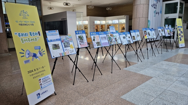 아동권리 포토보이스가 전시된 수원시청 본관 로비.