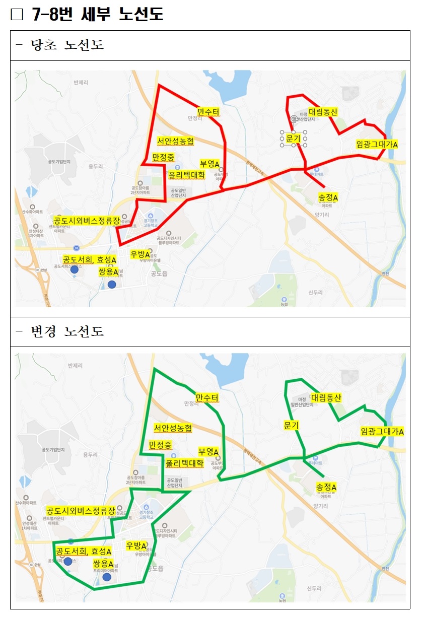 안성시는 공도읍 일원 도로 신규 개통 및 아파트 입주에 따라 시민들의 대중교통 이용 편의를 위하여 8월 19일부터 7-8번 시내버스 노선을 개편한다고 밝혔다.