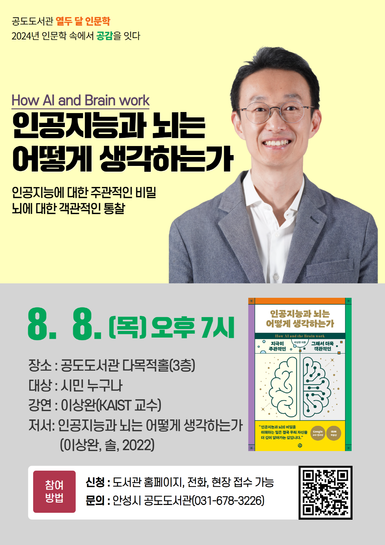 안성시 공도도서관은 오는 8월 8일 목요일 오후 7시, '인공지능과 뇌는 어떻게 생각하는가' 프로그램을 공도도서관 3층 다목적홀에서 진행한다.
