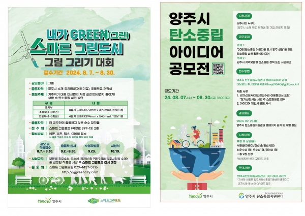 공모 분야는 △내가 GREEN 스마트 그린도시, △양주시 탄소중립 아이디어 등 2개 분야로 △기후 위기 대응 미세먼지 저감 실천, △생활 속 탄소중립 실천 방안, △지역 맞춤형 탄소중립 정책 제안 등 전반적인 대기 환경 분야를 주제로 다룬다.