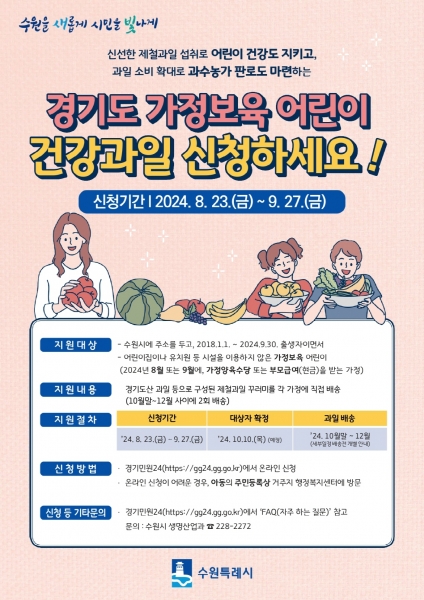 [금요저널] 수원시가 8월 23일부터 9월 27일까지 ‘2024년 경기도 가정보육 어린이 건강과일 지원사업’ 으로 과일 꾸러미를 받을 가정보육 어린이를 모집한다.