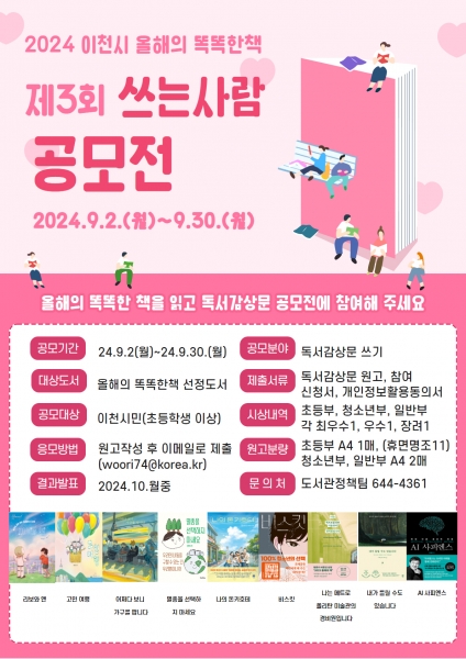 [금요저널] 이천시 도서관은 이천시민들에게 독서와 글쓰기를 통해 문해력을 높이고 인문학적 소양을 높일 수 있는 기회를 제공하고자 ‘2024 올해의 똑똑한 책’을 읽고 독후감 쓰기 대회인 ‘제3회 쓰는 사람 공모전’을 개최한다.