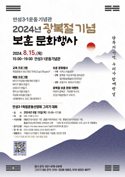 [금요저널] 안성시 3·1운동기념관은 오는 8월 15일 ‘2024년 광복절 기념 보훈 문화행사’를 개최한다.