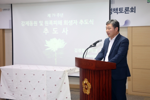 본 토론회에 앞서 식전행사로 진행된 “제79주년 강제동원 및 원폭피해 희생자 추도식”은 김정렬 수원특례시의회 부의장과 사정희 수원특례시의회 시의원, 행사 관계자 등 40여명이 참석해 희생자를 기리는 묵념과 박상복 경기도원폭피해자협의회 회장과 김정렬 수원특례시의회 부의장의 추도사, 추모시 낭독, 헌화 순으로 진행됐다.