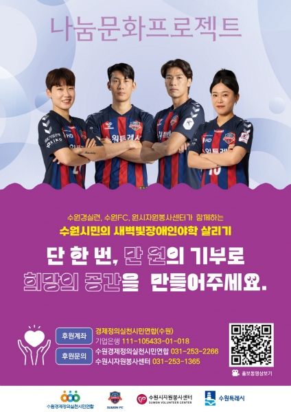 시민구단인 수원FC와 수원FC위민 선수들이 참여한 수원새벽빛 장애인야학 살리기 포스터.