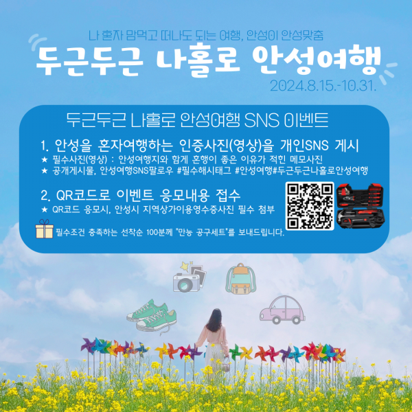 ‘두근두근 나홀로 안성여행’ SNS이벤트 참여방법은 안성을 혼자 여행하는 인증사진이나 영상을 개인SNS 에 인증 후 QR코드로 응모하면 된다.