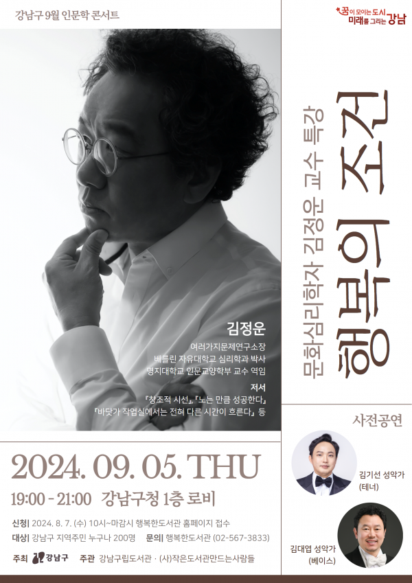 인문학 콘서트는 강남구통합도서관 홈페이지에서 200명을 대상으로 사전 접수를 받는다.
