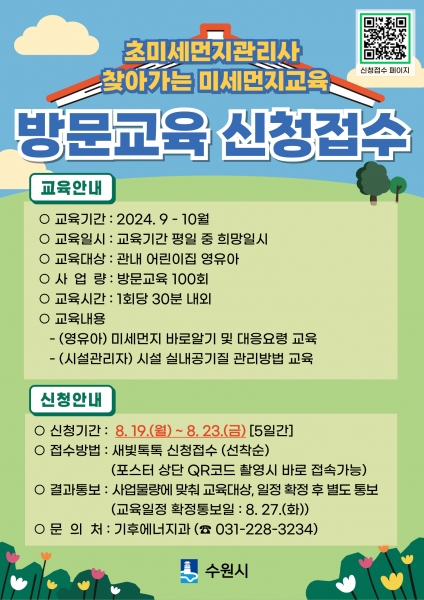 한편 수원시는 2019년부터 2024년까지 초미세먼지관리사 양성 교육으로 77명의 초미세먼지관리사를 양성했고 어린이집을 대상으로 1366회 찾아가는 미세먼지 교육을 진행했다.