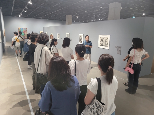 휴먼콜센터 상담사들이 수원시립미술관에서 전시해설을 듣고 있다.