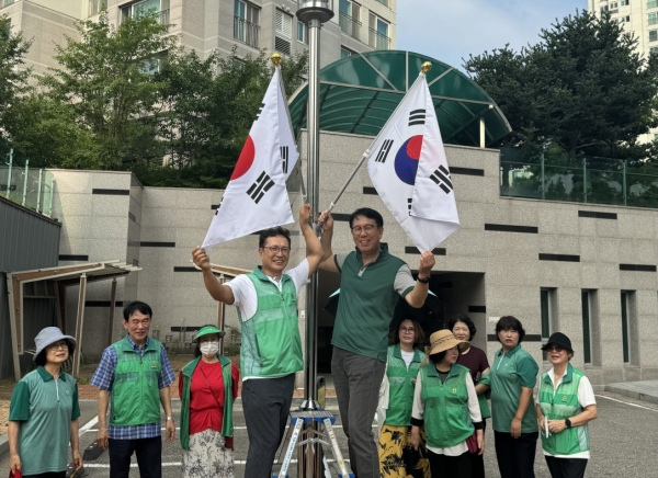 [금요저널] 인천 서구 청라1동 새마을협의회는 15일 오전 제79주년 광복절을 기념해 관내 아파트 2곳에 ‘아파트 태극기 거치대 설치 시범사업’을 추진했다.