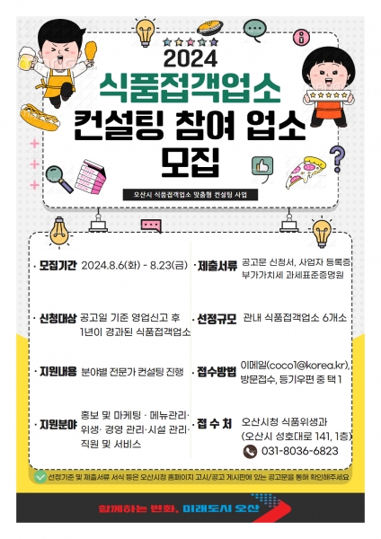 [금요저널] 오산시는 관내 외식업 활성화 및 식품접객업소 대상 자율 경영 관리·위생 수준 향상을 위해 ‘2024년 식품접객업소 맞춤형 컨설팅 사업’을 진행하고 참여 업소를 이달 23일까지 모집한다.