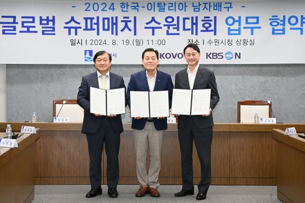 수원시와 한국배구연맹, KBSN은 19일 수원시청 상황실에서 업무협약을 체결하고 ‘2024 한국·이탈리아 남자배구 글로벌 슈퍼매치 수원대회’의 성공적인 개최를 위해 협력하기로 했다.