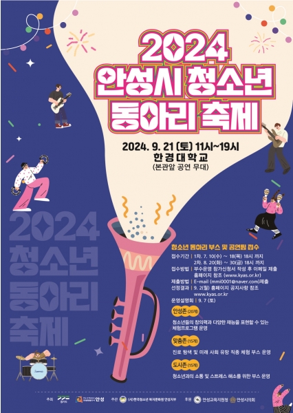 [금요저널] 안성시는 오는 9월 21일 11~19시 한경국립대학교 운동장 일원에서 지역 청소년과 지도자, 시민 등 2천여명이 참여하는 가운데 펼쳐질 ‘2024 안성시 청소년동아리축제’를 빛내 줄 각종 체험 및 공연, 진로 탐색으로 구성된 청소년동아리나 각 대학, 기업체가 운영하는 부스 50여개 및 공연동아리 45팀을 모집한다고 밝혔다.